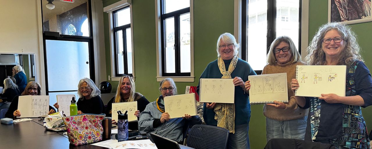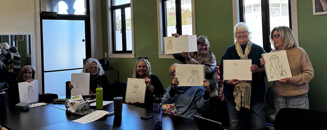 As class participants, we became attached and intrigued with the drawing process, and with each other. We formed a monthly group on the third Wednesday of each month. This group is based at the Green Room in CCA, but occasionally we may meet in members' homes or take field trips. We take turns providing inspirational exercises to trigger the creative process. While attendance each month is not required, we hope to continue as a community of creators, guides, and inspirational support.