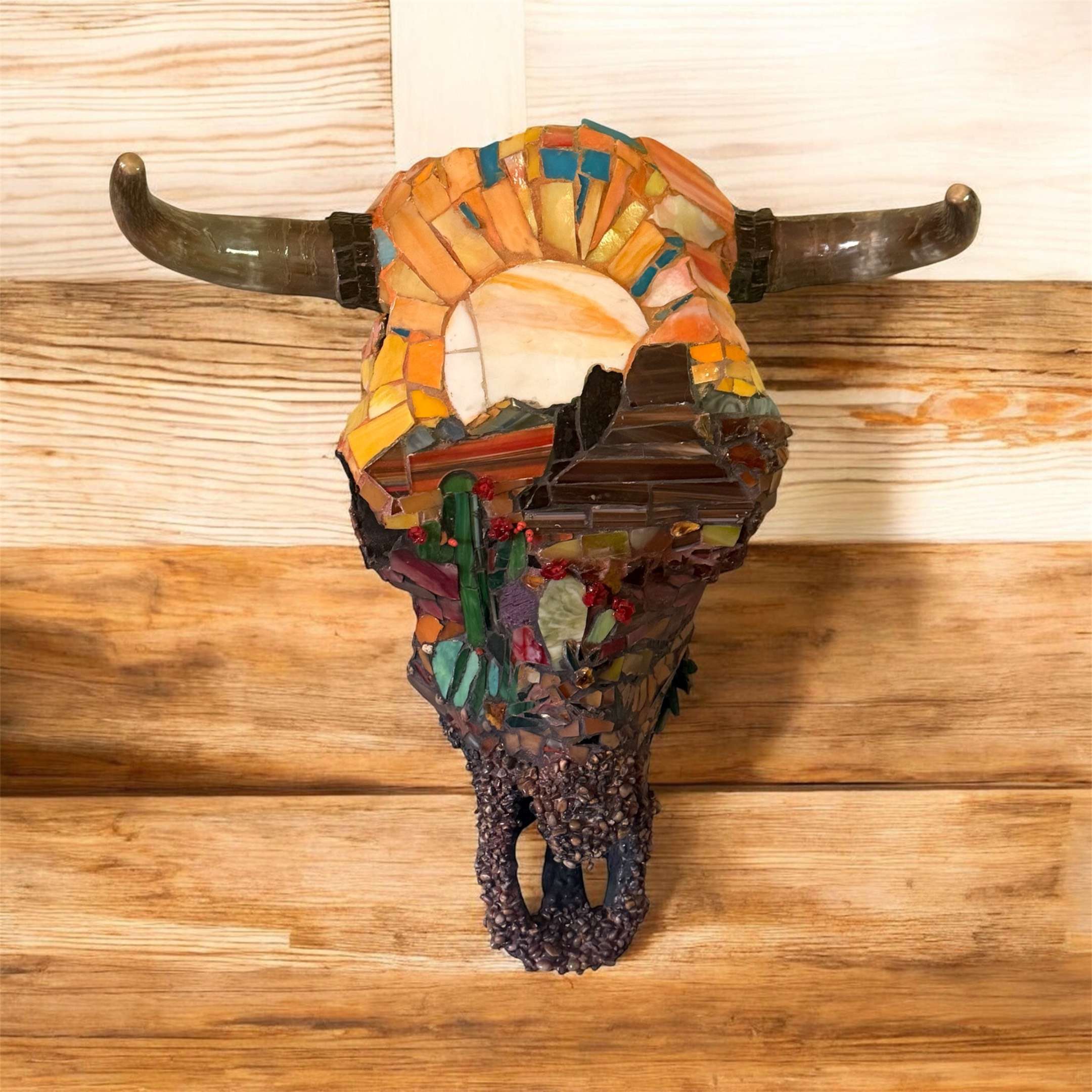 Stain glass hand cut tiles. Rock formation is expanding foam with real coral and shells. Glass